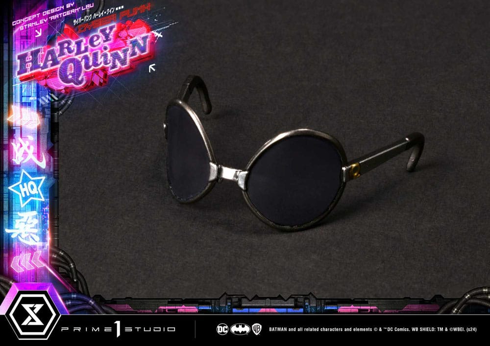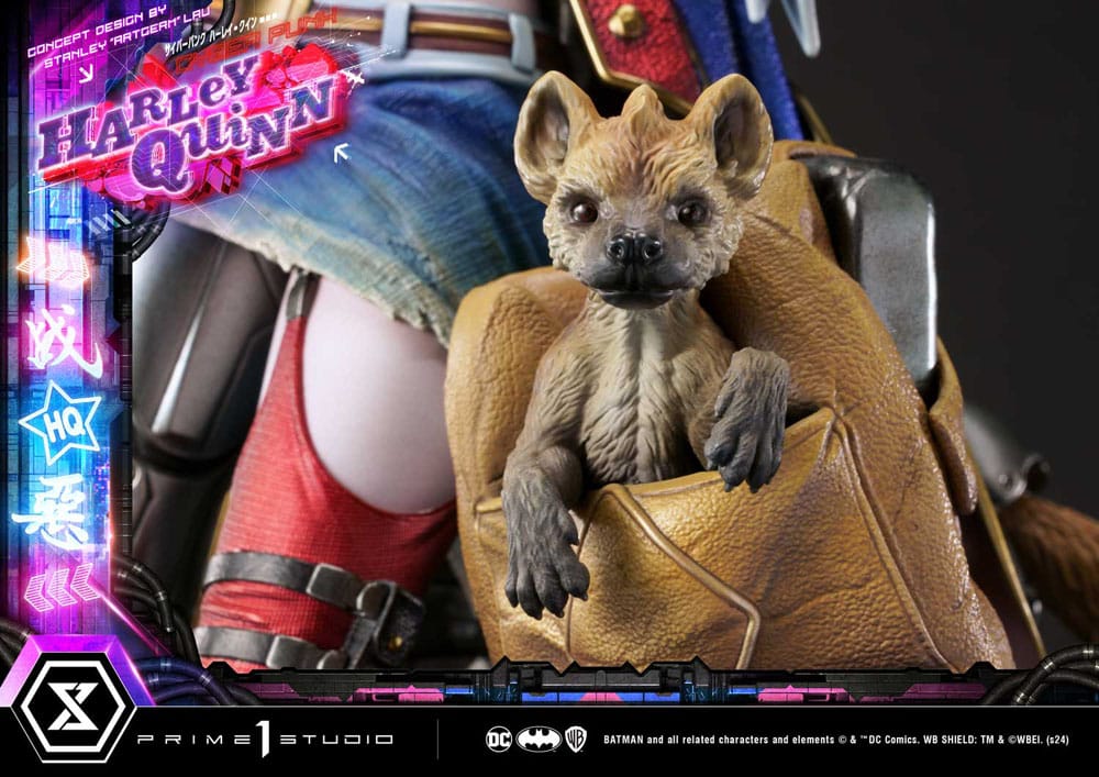 Standing over 24 inches tall, this new and improved Harley has been redesigned from head to toe. Her edgy yet playful demeanor is captured in her striking stance, her weapon nestled comfortably between her elbows and back as she makes a horn gesture with both hands, exuding a subtle blend of casualness and confidence. Like virtually every other inhabitant of Cyberpunk Gotham, she is enhanced by cybernetics—technological modifications applied to the human body to enhance physical and mental capabilities, blurring the line between man and machine. Her right-side appendages have been augmented and completely replaced with cyborg prosthetics. Her outfit has also been redesigned to match her cutting-edge futuristic fashion style, while retaining her signature red and blue duality. Her initials are featured on the back of her coat. As usual, she is accompanied by her faithful hyenas Bud and Lou. As you can see, cybernetic enhancements aren't just reserved for humans. They all sit atop a cyberpunk city-themed base featuring LED lighting. It wouldn't be cyberpunk without neon lights, right? You can display Harley with a softer, more poised facial expression or a sharper tongue with the two included head pieces. We've also added a pair of sunglasses and a head stand.
