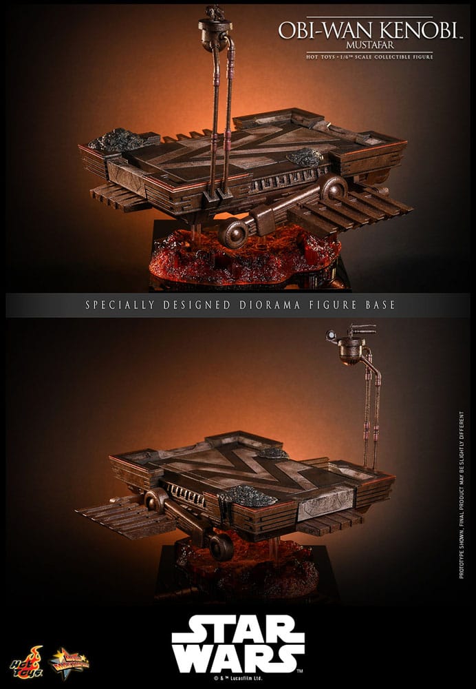 The Star Wars action figure is dressed in a finely tailored costume with weathering effects to capture the intensity of the fierce duel on Mustafar. His outfit includes a tabard, outer tunic, and undertunic, all tied together at the waist with an obi and a detailed utility belt, complemented by trousers and long boots. Nine interchangeable hands and blue lightsaber blades with illuminated and non-illuminated LED grip options are included for dynamic action. The figure is displayed on a specially designed diorama base with a repulsor platform and lava effects that replicate the volcanic landscape of Mustafar, allowing collectors to recreate the iconic duel scene between Obi-Wan Kenobi and Anakin Skywalker.