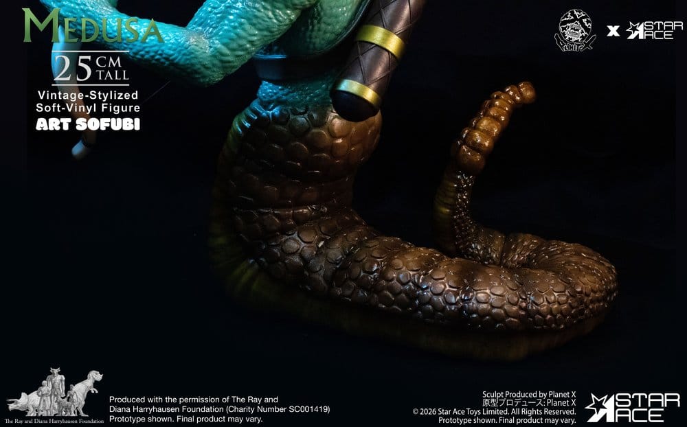 Star Ace ART SOFUBI Serie: Medusa - Collezione Ray Harryhausen Stile vintage. Mostro leggendario. Tributo senza tempo. Inizia la caccia! Star Ace svela con orgoglio la prossima straordinaria uscita della nostra serie di personaggi in morbido vinile in stile vintage: la terrificante Medusa, che emerge dalle mitiche profondità del classico Scontro tra Titani del 1981. Licenza ufficiale come parte della collezione Ray Harryhausen, questa Gorgone dai capelli di serpente scivola sul tuo scaffale in audace stile sofubi retrò. Progettata da @planetxasia e alta imponente 25 cm (10 pollici), questa figura cattura la grazia sinistra di Medusa con una scultura esagerata e caratteristica e uno schema di verniciatura vibrante. Ogni scaglia, serpente e sguardo gelido è reso con un cenno nostalgico ai giocattoli sofubi giapponesi vintage che fondono la storia del cinema con l'arte da collezione. Questo oggetto da collezione altamente posizionabile include un braccio destro commutabile per opzioni di visualizzazione dinamiche. Personalizza la sua posizione con la mano aperta per una posa in bilico, da stalking, oppure attacca la mano che tiene la freccia per abbinarla perfettamente all'arco tenuto nella mano sinistra, completando la sua iconica posizione d'attacco. Perfetto per i collezionisti di personaggi retrò in vinile, i fan della leggendaria arte stop-motion di Harryhausen e chiunque ami i mostri mitici reinventati con stile e anima.