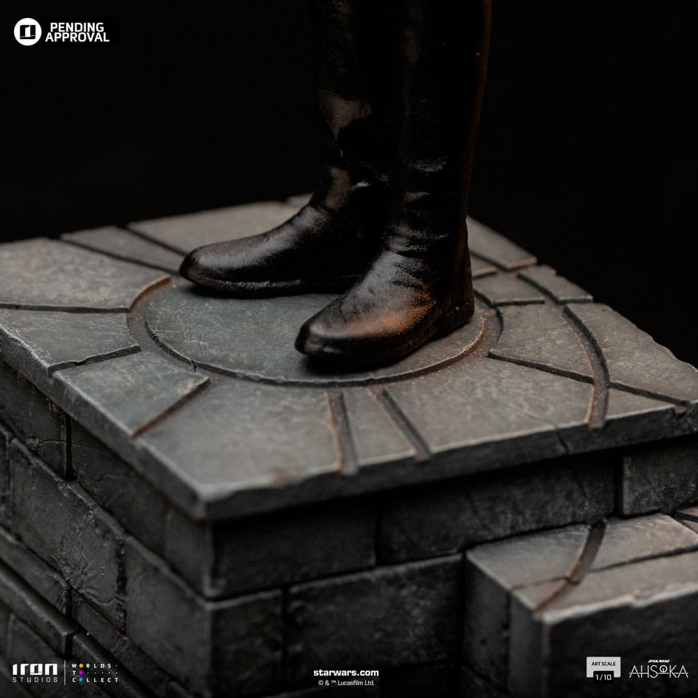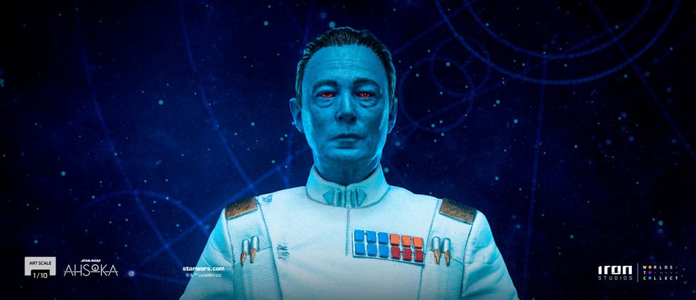 Riconosciuto all'inizio della sua carriera militare come Mitth'raw'nuru, un alto grado nell'esercito, il Grande Ammiraglio della Marina Imperiale durante l'era dell'Impero Galattico, un alieno della specie Chiss originaria del pianeta Rentor dalla pelle blu dall'aspetto freddo come il suo volto e gli occhi rossi sinistri come quelli di un predatore. Conosciuto come uno stratega brillante e implacabile, con le mani sulla schiena, in posizione militare a riposo, indossando la sua uniforme bianca da ufficiale in comando della Chimaera, uno Star Destroyer di classe I Imperiale da lui modificato e comandato, e portando un charric, un'arma Chiss simile a un blaster, nella fondina nella parte destra della cintura nera. Sopra una base rialzata dagli aspetti rocciosi, che ricorda la fortezza custodita dalle tre streghe che si autodefiniscono le Grandi Madri, Iron Studios presenta la statua "Grand Admiral Thrawn - Star Wars - Art Scale 1/10", con il temibile e rispettato cattivo pronto a prendere il suo posto come Erede dell'Impero, come presentato nella serie originale Ahsoka del servizio di streaming Disney +.