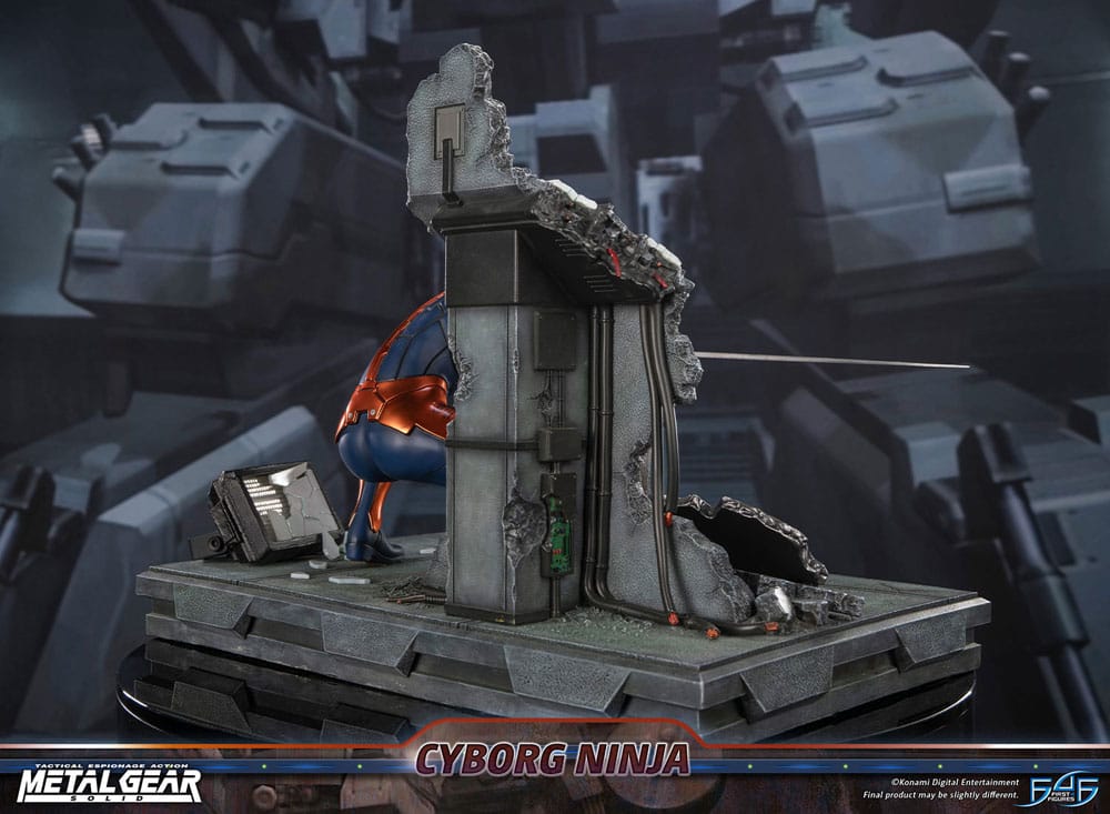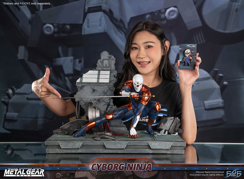 La statua è ispirata all'intensa battaglia contro il boss in cui Cyborg Ninja e Solid Snake affrontano Liquid Snake, che sta pilotando il Metal Gear REX. Raffigura Cyborg Ninja in una posa dinamica, simile a un ninja, che brandisce la sua lama ad alta frequenza nella mano destra. La statua cattura fedelmente il suo aspetto, mettendo in mostra l'esoscheletro ninja cyborg blu, marrone e bianco, con la caratteristica lampada rossa al centro della maschera facciale fiancheggiata da fori per gli occhi su entrambi i lati. Il design della base ricrea meticolosamente la scena della battaglia contro il boss ambientata nella base sotterranea di Shadow Moses.
