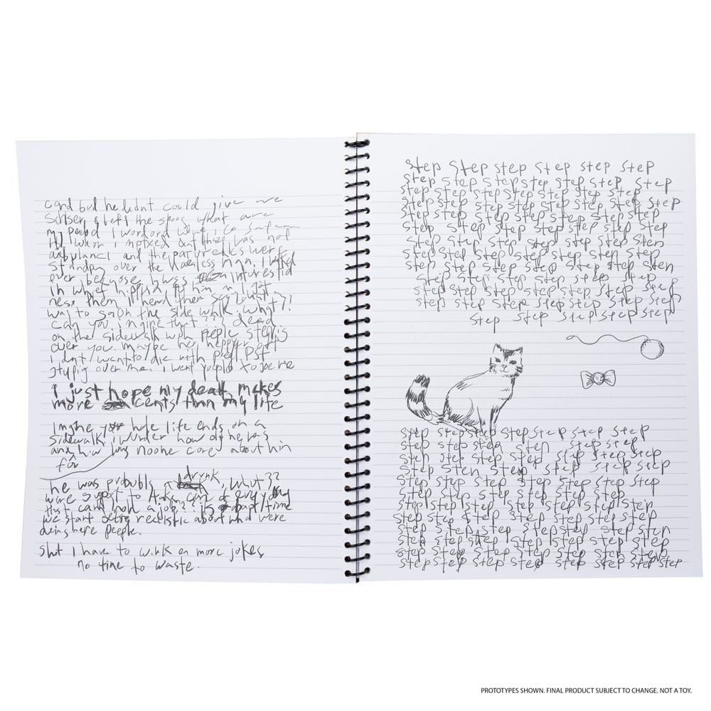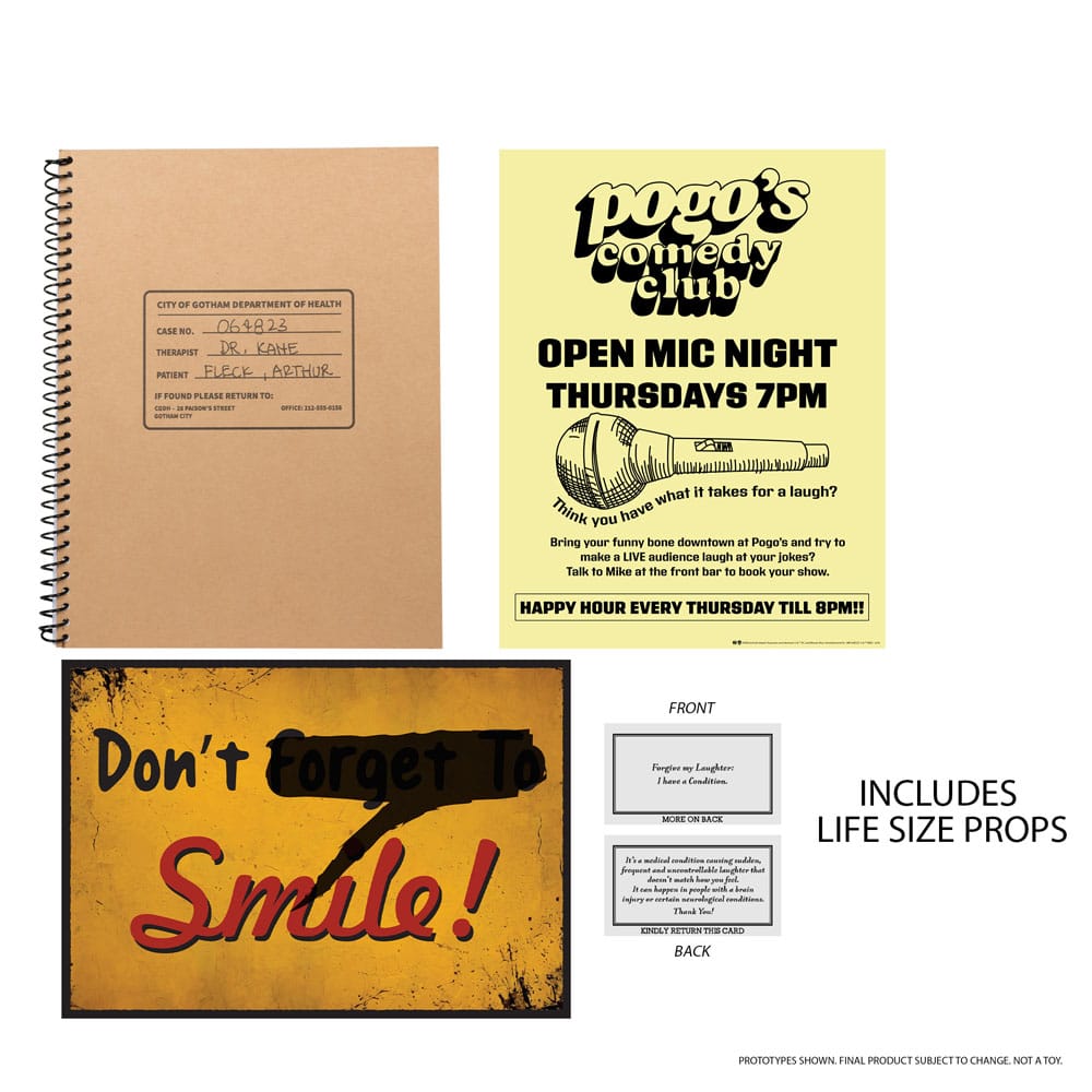 - Include anche oggetti di replica di proposta di vita: Notebook Joker, "Non dimenticare di sorridere" (metallo), poster per la notte del microfono (carta) e perdona le mie risate (stock di carte)