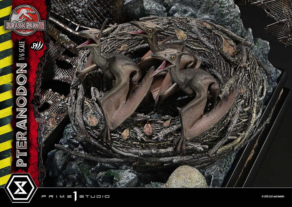 Una scena agghiacciante si svolge nella nebbia: le urla squarciano l'aria mentre il bambino viene trascinato in un nido dove echeggiano grida acute. Ispirata al terrore vissuto da Eric, questa statua in scala 1/6 cattura il mondo dei predatori alati con dettagli sorprendenti. Lo Pteranodonte adulto ripiega le sue vaste ali mentre veglia sul nido sottostante. I giovani affamati si spingono avanti, con la bocca aperta per la disperazione. La composizione evoca un potente senso di unità tra specie, trasmettendo il messaggio che questo non è un posto per gli esseri umani e che anche lo spettatore è visto come una preda.