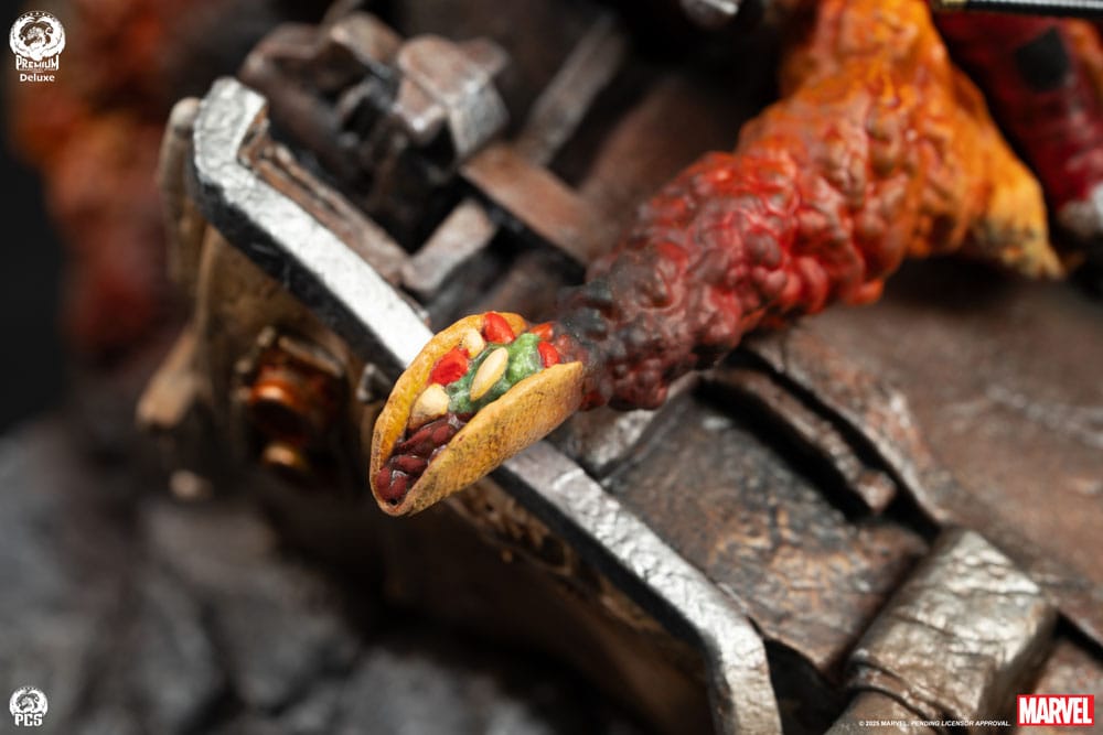 Questo diorama completamente scolpito presenta una collezione di "piscine che scattano da un'enorme esplosione di taco-camion al centro dell'azione. Diversi membri del famigerato Corpo di Deadpool sono rappresentati qui tra cui LadyPool, Kidpool e Headpool con l'uomo stesso che si impegna con un fidato Ol 'Dogpool al suo fianco. Ogni personaggio è sapientemente scolpito e dipinto per catturare l'eccitazione di questi personaggi preferiti dai fan.