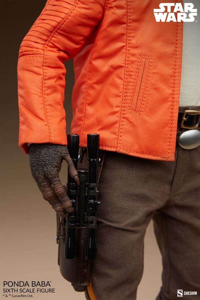 Ispirata all'apparizione del personaggio in Una nuova speranza, questa figura di Star Wars completamente articolata e altamente snodabile indossa un costume in tessuto tagliato e cucito, inclusi pantaloni marroni, stivali neri, una camicia grigio chiaro e una giacca arancione brillante. La figura di sesta scala di Ponda Baba viene fornita con un blaster, una fondina per blaster e tre mani alternative scambiabili con le dita ferocemente artigliate di Ponda.