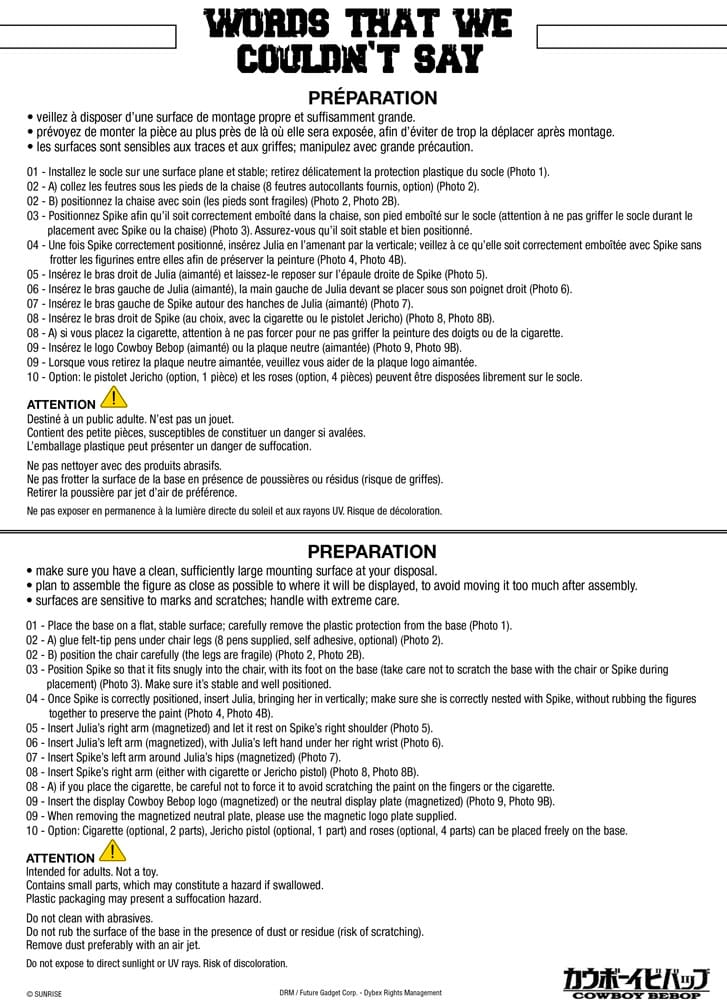 Il team della Future Gadget Corporation ha lavorato intensamente, con tutta la sua passione, per riprodurre una delle opere d'arte più toccanti della serie raffigurante i due amanti. Spike, nei suoi primi anni, mostra il design "malvagio" dei suoi giorni da mafioso, mentre Julia indossa il suo caratteristico abito nero. I suoi capelli dorati scendono con grazia fino ai fianchi.