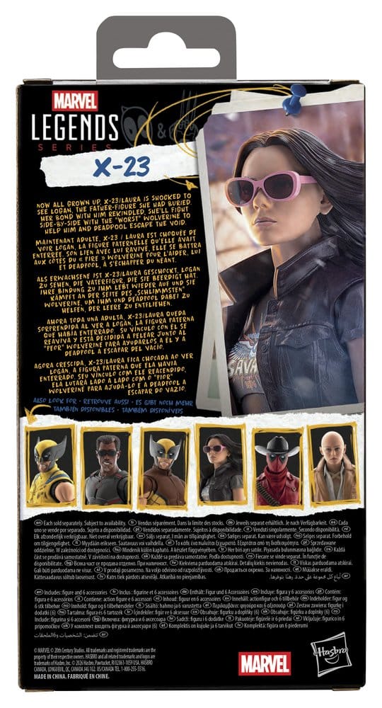 Porta l'eccitazione e la meraviglia dell'Universo Marvel nella tua collezione con questa action figure Hasbro Marvel Legends X-23! Questa figura Marvel da collezione in scala da 6 pollici è dettagliata per assomigliare all'aspetto del personaggio in Deadpool & Wolverine dei Marvel Studios. La figura di X-23 è completamente articolata con un design premium e testa, braccia e gambe posizionabili. Il set di action figure Marvel viene fornito con 6 accessori, tra cui testa e mani alternative per mostrarla con o senza artigli e occhiali da sole. La scala da 6 pollici delle action figure Hasbro Marvel le rende perfette per essere esposte nelle collezioni dei fan. Reinventa scene ispirate al film sul tuo scaffale con le action figure Marvel Legends e gli oggetti da collezione Marvel.