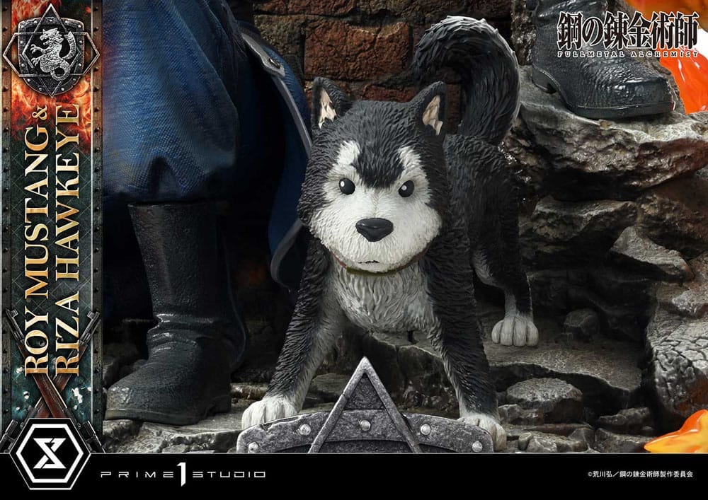 I nostri artigiani di Prime 1 hanno prestato estrema cura nel progettare e catturare l'energia dinamica di Roy Mustang e Riza Hawkeye in azione. Roy, il carismatico e ambizioso Alchimista della Fiamma, si lancia in azione con grande compostezza, con la mano tesa in avanti - scintille circondano la sua mano tesa mentre si prepara a scatenare una devastante magia del fuoco. Riza, la fedele tenente, è accovacciata su un ginocchio, fornisce fuoco di copertura, i suoi occhi acuti sono concentrati, pronta a colpire con il suo fucile. Il loro profondo legame e la fiducia reciproca sono al centro di molti momenti cruciali della serie, e ci siamo sforzati di ricrearli in questa splendida scultura. Come sempre, i nostri esperti non si tirano indietro quando si tratta di dare vita ai personaggi disegnati - le texture e le ombreggiature di ogni tipo di materiale sui personaggi sono attentamente pensate ed eseguite alla perfezione, dalle rughe dell'uniforme militare Amestris del colonnello Mustang alle venature del legno del fucile del tenente Occhio di Falco. Non dimentichiamo che entrambi sono protetti dal coraggioso ed energico Hayate Nero - Che carino! La base presenta lo stemma di Amestris, circondato dagli effetti di fiamme e fumo che avvolgono il nostro duo in una magnifica esibizione di offesa e difesa. I nostri pittori hanno utilizzato una tecnica di gradazione della vernice per le fiamme, aggiungendo un aspetto estremamente realistico alla statua nel suo insieme, da lontano, le fiamme sembrano brillare anziché usare LED. Questa statua è destinata a stupire tutti i fan che potrebbero posare gli occhi su di essa.