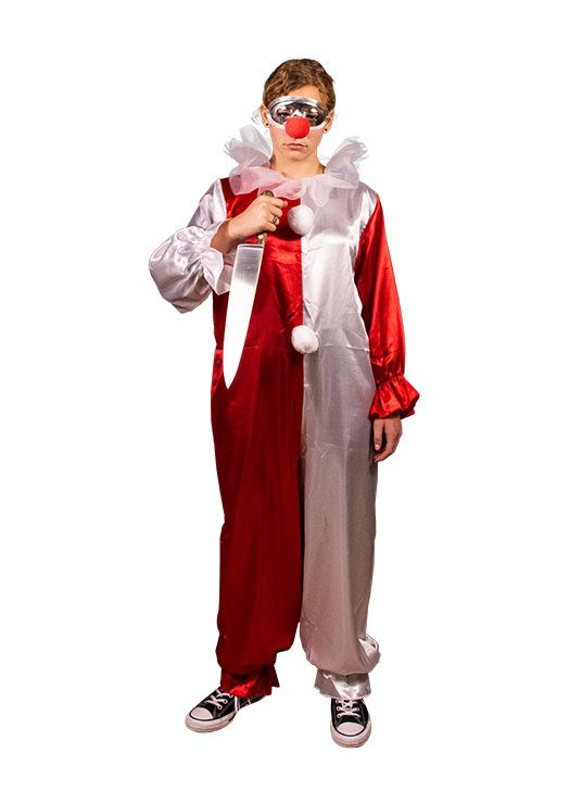 Questo costume viene fornito con il costume da clown di Jamie Lloyd e la maschera da clown del bandito con il naso da clown rosso.