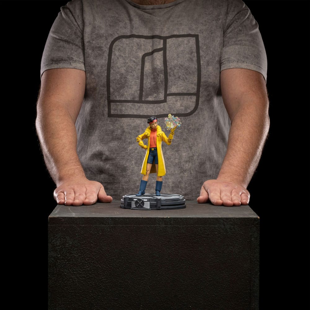 In modo disinvolto, la giovane mutante cinoamericana usa giocosamente i suoi poteri, creando una sottile esplosione a forma di fiore colorato con la mano sinistra, grazie alla sua capacità di produrre energia plasmoide, mentre fa una bolla con la sua gomma da masticare. Allegro, impulsivo, giocoso e talvolta anche un po' ingenuo, il suo outfit classico con stivali e pantaloncini blu navy, un top rosa e occhiali e il suo indispensabile trench giallo con guanti abbinati rimane quasi uno standard per la sua identità visiva. Una delle figure più ricercate da fan e collezionisti, caratterizzata da innovazioni nella sua verniciatura con uno specifico cel shading che fa sembrare tutte le figure di questa nuova collezione come se uscissero dallo schermo televisivo per entrare nel mondo reale, Iron Studios presenta la statua "Jubilee - X-Men '97 - Art Scale 1/10", fissata su una base tematica a forma del logo X della squadra di supereroi mutanti e caratterizzata da una testa extra senza la bolla di gomma da masticare, ispirata al fortunato serie animate disponibili sul servizio di streaming Disney+.